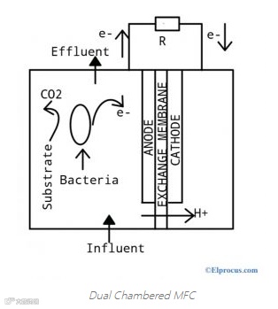 这是一种典型的技术,由两个腔室组成,它们由交换膜隔开。它以批处理模式运行,并在连续模式下工作。双腔MFC的设计如下图所示。为了发电,它使用醋酸盐或葡萄糖作为底物。常见的有圆柱形,矩形,向上流动的圆柱形,微型和u形阴极。