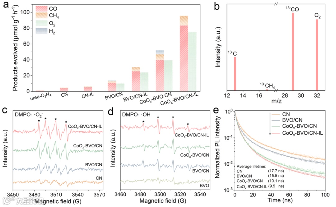 Figure 2. (a) Photocatalytic activities of CO2 reduction for a series of samples under light irradiation, (b) Mass spectra of the products from the photocatalytic reduction of 13CO2 over CoOx-BVO/CN-IL. DMPO spin-trapping EPR spectra recorded for •O2- (c) and •OH (d) under light irradiation for CN, BVO, CoOx-BVO/CN and CoOx-BVO/CN-IL. Detection conditions: the concentration of DMPO is 50 mmol L-1. •O2- and •OH were determined in methanolic solution and aqueous phase, respectively. (e) Time-resolved PL spectra of CN, BVO/CN, CoOx-BVO/CN and CoOx-BVO/CN-IL.