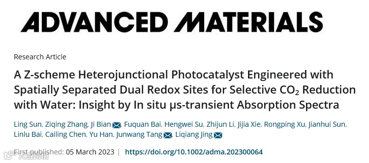 基于此,黑龙江大学井立强教授、边辑副研究员与清华大学唐军旺教授合作,在国际顶级期刊Advanced Materials上发表题为“A Z-scheme heterojunctional photocatalyst engineered with spatially separated dual redox sites for selective CO2 reduction with water: insight by in-situ μs-transient absorption spectra”的研究论文。
