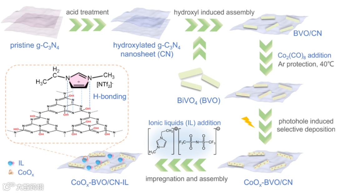 Figure 1. Schematic illustration of the design and controlled synthesis process of spatially separated CoOx and IL modified BVO/CN (CoOx-BVO/CN-IL).