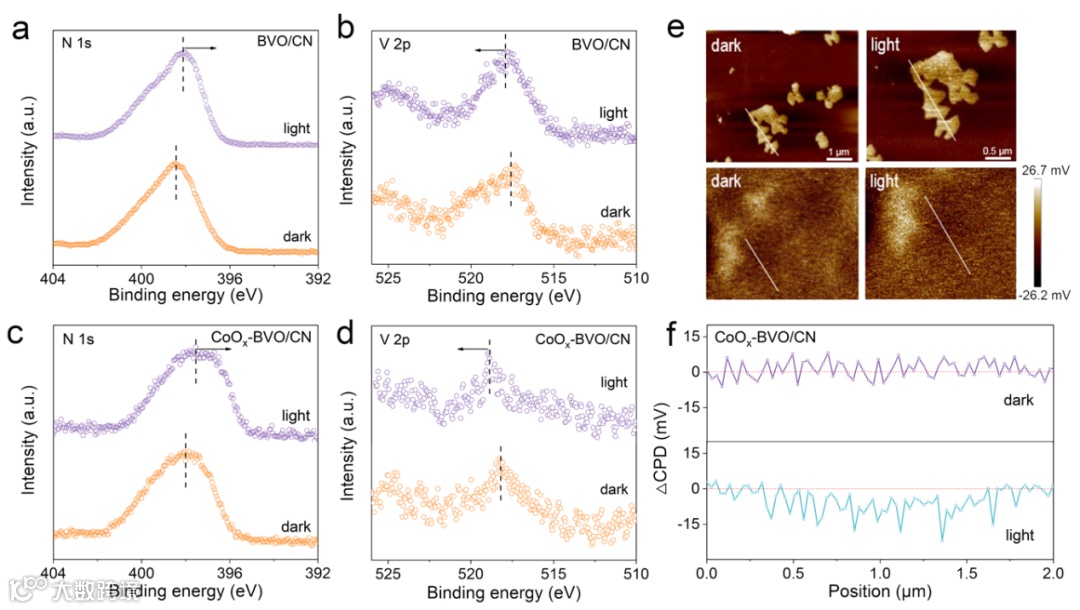 原位光照XPS和光照条件下开尔文探针力显微镜结果显示,CoOx负载后的样品光照前后N 1s、V 2p的结合能变化相较于BVO/CN更加明显、光照前后的接触电势差更大。表明引入的CoOx亚纳米团簇可有效调控BVO和CN界面的Z型电荷转移与分离。