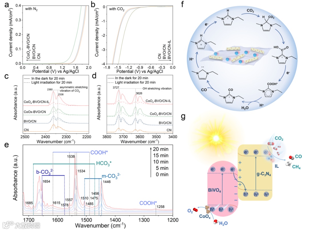 Figure 5. (a) Electrochemical oxidation curves of CN, BVO/CN and CoOx-BVO/CN in a N2-saturated electrolyte, (b) Electrochemical reduction curves of CN, BVO/CN and BVO/CN-IL in the CO2-saturated electrolyte. In-situ DRIFTS for adsorbed CO2 (c) and H2O (d) in the dark for 20 min and under light irradiation for 20 min of CN, BVO/CN, CoOx-BVO/CN and CoOx-BVO/CN-IL. (e) In-situ DRIFTS for the detected intermediates of CoOx-BVO/CN-IL in course of the light irradiation, (f) Proposed mechanistic pathway for the CO2 reduction reaction catalyzed by IL, (g) Schematic of the charge transfer and the involved redox reactions on CoOx-BVO/CN-IL.