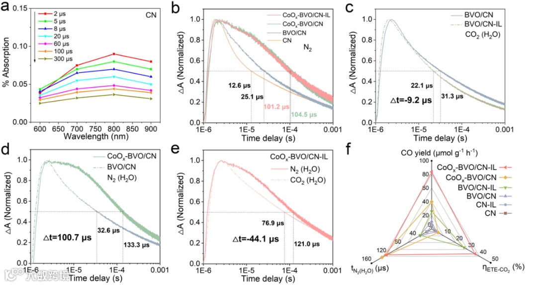 Figure 4. (a) μs-TAS spectra of CN in water, (b) μs-TAS decay kinetics of CN, BVO/CN, CoOx-BVO/CN and CoOx-BVO/CN-IL in N2, (c) μs-TAS decay kinetics of BVO/CN and BVO/CN-IL in CO2(H2O) condition, (d) μs-TAS decay kinetics of BVO/CN and CoOx-BVO/CN in N2(H2O) condition, (e) μs-TAS decay kinetics of CoOx-BVO/CN-IL in different atmospheres, (f) plots on relationships of half-life time (t50%), electron transfer efficiencies (ETE) and CO yields of the investigated samples.