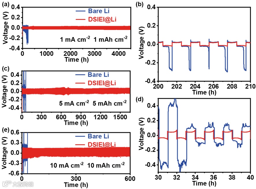 图4. 基于裸锂和DSIEI@Li阳极的对称电池循环性能。(a) 1 mA cm-2/1 mAh cm-2和(b) 对应200-210小时的放大图,(c) 5 mA cm-2/5 mAh cm-2和(d) 对应30-40小时的放大图,(e) 10 mA cm-2/10 mAh cm-2对称电池的电压-时间曲线。