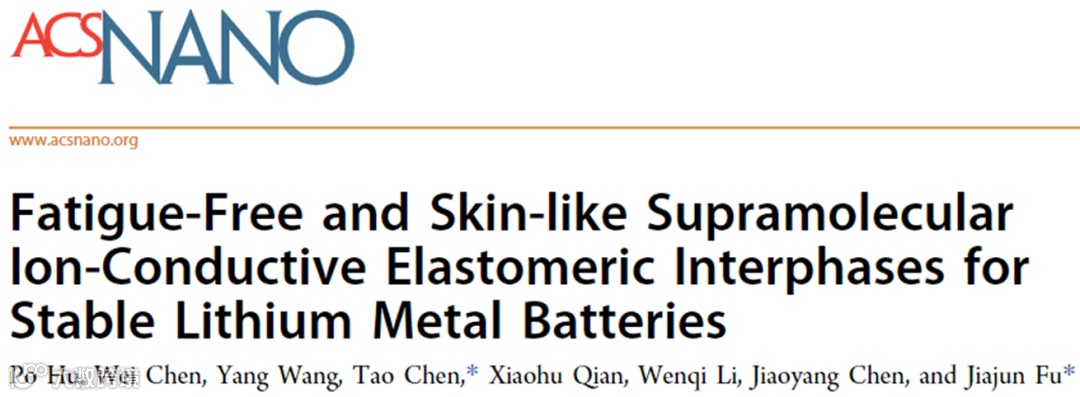 近日,南京理工大学傅佳骏教授与陈涛教授在金属锂负极领域取得关键进展,在国际知名期刊ACS Nano上发表题为“Fatigue-Free and Skin-like Supramolecular Ion-Conductive Elastomeric Interphases for Stable Lithium Metal Batteries”的研究论文。该文章使用一种抗疲劳、类皮肤的动态超分子基离子导电弹性(DSIEI)作为金属锂负极保护层。依靠体系中锁相分子结构的存在,实现锂金属电池在高电流密度和大面积容量下的长时间稳定循环运行。