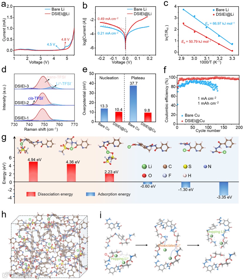 图3. (a) 裸锂和DISEI@Li的LSV曲线,(b) DISEI@Li和裸锂对称电池的Tafel曲线,(c)阿伦尼乌斯拟合曲线确定裸锂和DSIEI@Li对称电池的活化能,(d) DISEI-1、DISEI-2和DISEI-3的拉曼光谱图,(e) 裸Cu和DISEI@Cu的成核过电位和传质控制平台,(f) 非对称电池在电流密度为1mA cm-2时,沉积容量为1mAh cm-2的库仑效率,,(g) DSE-LiTFSI复合物的解离能以及Li+与含氧基团之间的吸收能,(h) DSIEI系统平衡后的MD仿真模型,(i) Li+在PPG链进行松散配位的迁移示意图。