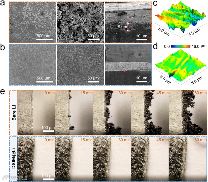 图5.在1mA cm-2,1mAh cm-2条件下时,300小时循环后(a) 裸锂和(b) DSIEI@Li的扫描电镜表面和截面图,300小时循环后(c) 裸锂和(d) DSIEI@Li的AFM图表征电极表面粗糙度,(e) 裸锂和DSIEI@Li在0.5 mA cm−2电流密度下放电0、15、30、45和60 min时的锂沉积情况。