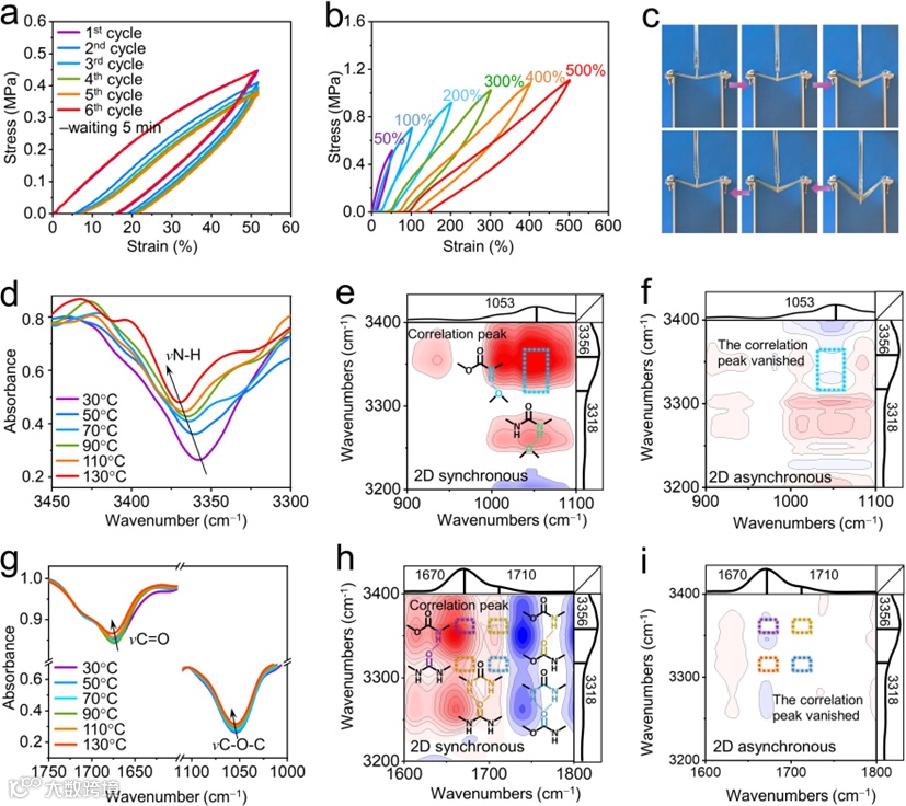图2. (a) DSIEI试样在50%应变下的连续循环拉伸曲线, (b) 不同应变下DSIEI试样的循环拉伸曲线,(c) 约0.8 mm厚度的DSIEI薄膜被钢针穿刺发生不同变形状态下的照片。(d)和(g) DSIEI在30~130℃的变温FTIR光谱。2DCOS同步(e, h)和异步(f, i)分别相关FTIR光谱。