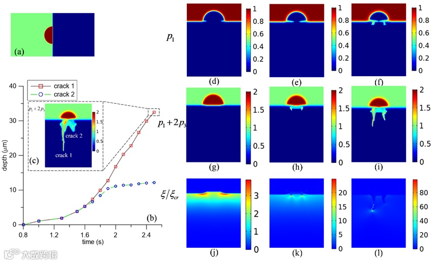 图4. 1MPa 竖向应力下,裂纹与枝晶的形成与演化过程:a) 模型初始状态,b) 固态电解质(Li6PS5Cl)的裂纹长度与时间关系,其插图c)为在2.5s时形态, d-f) p1形态,g-i) p1+2p3 形态, j-l) 无量纲化的应变能(ξ/ξcr)。