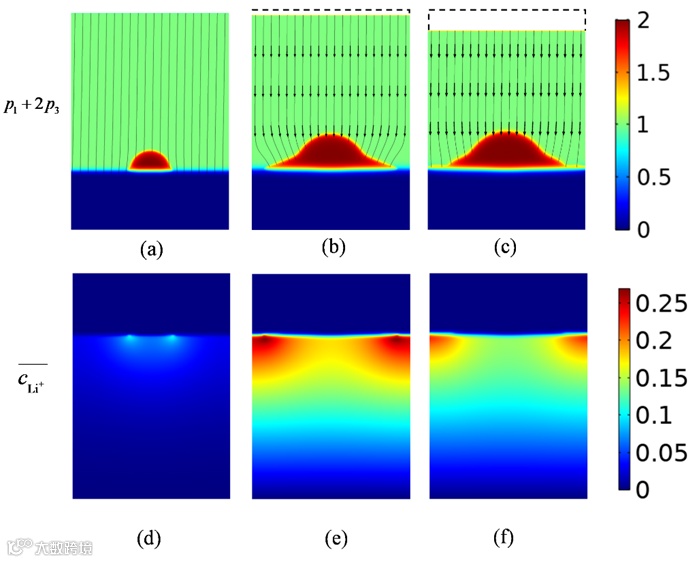在电剥离过程中,锂金属表面的锂原子传输速度高于体内,因而孔洞不断生长。在1MPa竖向压力的作用下,锂金属蠕变,其位移轨迹如图3(a-c)中流线所示,由此,得到“草帽形”的孔洞,其尺寸在电化学剥离与锂金属蠕变两者共同作用下稳定在一个固定值。但由于孔洞在剥离过程中的不断涌现与融合,在实验上我们通常观察到更为扁平的多种尺寸的孔洞。锂离子在电解质晶格间隙传导,这样的孔洞导致了锂离子相对浓度的不均匀性(图3(d-f)),但其产生的压应力并不会造成电解质的断裂,与实验结果相符[1]。