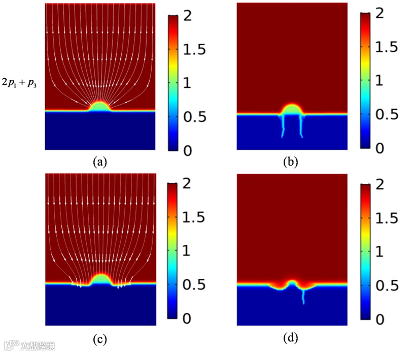 施加竖向压力作为固态电池中最常用的优化方法,被认为可以有效地保证锂金属电极与固态电解质之间的接触面积,从而使得电池的表面阻抗降低,并提升电池性能与寿命。但竖向压力并不是越大越好,在我们的模拟中发现:不外加电流或电压,只施加竖向压力分别为5 和 10 MPa时,通过对锂金属的挤压,孔洞确实变得更小,但在10 MPa时,锂金属在孔洞边缘应力集中,破坏固态电解质,并被挤入其中(图5(a, c))。当我们分别在5 和 10 MPa 下施加恒电压沉积,5MP时,我们发现在孔洞变小闭合前,断裂就已发生,锂金属被挤入裂纹中;在 10MPa时,虽然孔洞几乎完全闭合,但固态电解质被破坏后,大量锂金属嵌入其中,并造成进一步的断裂(图5 (b, d))。