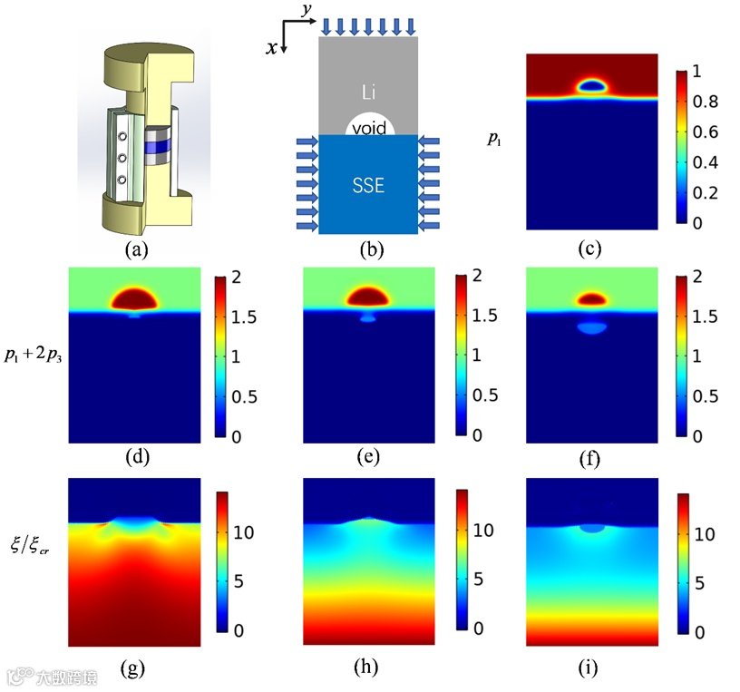 图7. 施加侧向压应力抑制断裂:a)典型的固态电池装置;b)模型示意图,其余条件不变的情况下施加侧向压应力;d-i)在3 GPa 侧向压应力下,电池形态与ξ/ξcr。