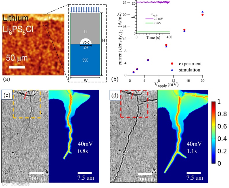 图2 计算模型与实验结果验证:a)左:实验文献中,在Li/Li6PS5Cl 界面处的孔洞[1],右:模型示意图。b) 模拟与实验的电流密度 j0与施加电压值Vapply对照图。c, d) 左侧为文献中电沉积后产生的裂纹[2],右侧为模拟结果。
