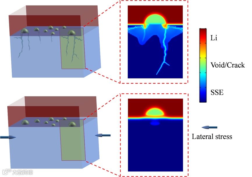 全固态锂金属电池,因其能量密度高与不易燃的特点,被认为是最具前景的下一代储能系统之一。固态电解质的发明使得人们期待锂枝晶的问题将得到彻底解决,但实验表明事实并非如此。我们对近期相关实验与理论工作进行了总结,以此为基础建立了一个电化学-力学耦合的多相相场模型,对锂金属界面孔洞的形成,固态电解质的断裂与锂枝晶生长进行了复现,并阐述了三者间的紧密联系。本文还对竖向压力(stack pressure), 极限电流密度(CCD),与断裂韧性等关键参数进行讨论,最终提出了以构建侧向压应力场来抑制固态电解质断裂的方法,为提高全固态锂电池的可靠性提供了解决方向。