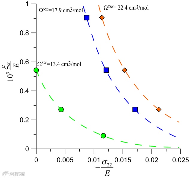 证明侧向压力对固态电解质断裂的显著抑制作用后,我们试图将侧向压应力σ22,固态电解质的临界应变能ξcr,与锂离子在固态电解质中的化学膨胀系数ΩSSE相结合。因不同的固态电解质有不同的杨氏模量E与ξcr, 因而,引入ξcr/E与-σ22/E两个无量纲量, 得到稳定性图 (图8)。每条虚线代表一个不同的化学膨胀系数,在此系数下,不同的临界应变能有对应的压应力大小,以达到图7所示的抑制效果。在虚线的右上方即为稳定区,左下方则为断裂产生区域。稳定性图明确地指出了高断裂韧性的重要性,例如,在相对较小的化学膨胀系数下,即ΩSSE=13.4 cm3 mol-1, 当固态电解质拥有一个相对较高的断裂韧性(103ξcr /E >0.54), 即使没有压应力,电解质也不会断裂。提高陶瓷固态电解质断裂韧性这一内禀性质是困难的,但在固态电解质表面构建压应力场却是易于做到的,例如,可以使用广泛应用于玻璃陶瓷领域的离子交换技术。