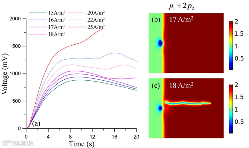 实验证明电剥离会在锂金属与固态电解质界面间产生孔洞[1],但孔洞在固态电池失效中所起的作用却不明晰。由此,我们在本文中考虑一个包含有锂金属(p1), 固态电解质(p2), 以及孔洞(p3) 的体系,其中序参量pi 分别代表这三种材料。立足于锂金属与固态电解质界面的一部分(图2(a)), 我们建立了一个电化学-力学耦合的三相相场模型,并根据实验中的电压电流关系对模型做校准(图2(b)), 最终复现Bruce课题组所观察到的固态电解质断裂情形[2]。
