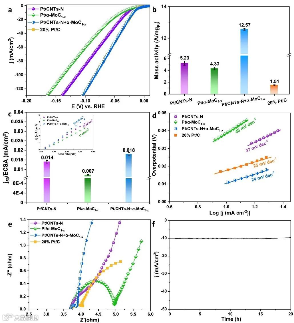 此外,Pt/CNTs-N+α-MoC1-x催化剂具有最高的比活性,这是由于上述双活性界面的形成提高了本征电催化活性。Tafel斜率也表明了Pt/CNTs-N+α-MoC1-x催化剂上实现了快速的反应动力学。同时,α-MoC1-x的加入更有效地分散和稳定了Pt物种,Pt/CNTs-N+α-MoC1-x催化剂在HER中表现出优异的长时间稳定性。