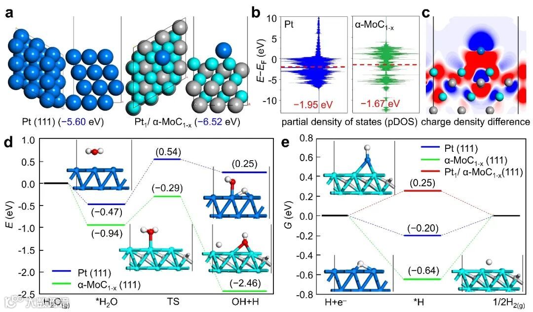 DFT计算表明Pt和α-MoC1-x具有相近的d带中心位置,两者之间容易产生较强的相互作用,Pt原子能够更稳定地分散在α-MoC1-x上。α-MoCl-x的加入有利于H2O的吸附、解离和表面H原子的产生。Pt (111)和Pt1/α-MoC1-x (111)上均具有合适的ΔG*H,说明Pt/CNTs-N+α-MoC1-x催化剂优异的HER性能来源于双活性界面的协同作用。