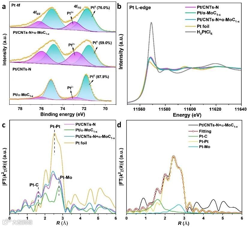 XPS结果发现相较于Pt/CNTs-N样品,Pt/CNTs-N+α-MoC1-x样品中Pt0物种的比例从59%增加到76%。Pt/CNTs-N+α-MoC1-x的Pt L边XANES白线强度均与Pt箔接近,表明Pt物种主要以0价态存在。Pt/CNTs-N+α-MoC1-x催化剂的FT EXAFS图中出现的Pt-Mo键进一步验证了Pt原子从碳纳米管再分散到α-MoC1-x上并形成Pt-α-MoCl-x新界面。