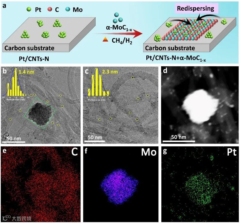 图1. (a) Pt/CNTs-N+α-MoC1-x催化剂的合成示意图;(b) Pt/CNTs-N+α-MoC1-x和Pt/CNTs-N催化剂 的TEM图;(d-g) Pt/CNTs-N+α-MoC1-x催化剂的元素分布图