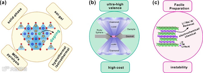 目前,大多数报道的HVOs在合成过程中采用元素掺杂策略,掺杂是调节TMOs电子结构、表面吸附能和电导率的有效方法。一般来说,选择具有相似离子半径但不同价态或电负性的外来金属离子作为掺杂剂,以改变母体材料结构的物理和(电)化学性质,提高OER性能。几乎所有常见的合成方法,包括固态法、溶胶-凝胶法、水热法、静电纺丝法和MOFs热解法,都可以用于元素掺杂,具体方法取决于目标掺杂催化剂和催化剂的晶格能量。另外,随着高压科学的发展,许多在常压环境条件下无法获得的高价态氧化物,可以通过超高压(2- 20gpa)和高温(800 - 2200℃)来获得,结果表明,高压下晶格的大幅度收缩可引起化合物的价态跃迁。此外,由于层状氧化物的特殊夹层结构,碱性金属(Li/Na/K)可以很容易地通过化学或电化学手段从晶体结构中去除,以迫使过渡金属达到更高的价态。