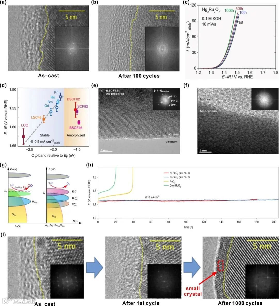 除了活性外,稳定性是OER催化剂的另一个重要性能指标,特别是在实际应用中。如上所述,有两种主要的OER机制涉及不同的中间体和电荷转移途径,它们对HVOs稳定性的影响不同。对于AEM途径,HVOs中M-O键的强共价不仅促进了金属位点和氧中间体之间的电荷转移,从而产生更高的本构活性,而且即使在高阳极电位下也能稳定核心晶体结构,从而使催化剂的OER稳定性大大增强。随着价态的进一步升高,LOM反应路径可能被激活,从而打破了“scaling”引起的过电位限制,从而促进更高效的OER。然而,LOM途径中晶格氧的反复“释放和再填充”可能导致表面不稳定,最终导致晶体结构崩溃,降低催化剂的稳定性。例如,Ba0.5Sr0.5Co0.8Fe0.2O3-δ(BSCF)的O 2p能级靠近费米能级,激发LOM反应路径,因而在所有钙钛矿结构的氧化物中表现出最好的OER本征活性。然而,在OER过程中,它经历了快速而完全的非晶化,导致其极差的催化稳定性。