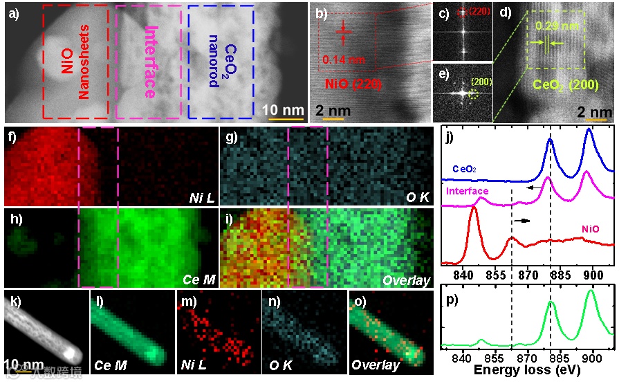 图4. NiO/CeO2 界面相互作用的原子分析:(a-e)HAADF图像和相应的FFT图;(f-i)Ce、Ni和O的元素EELS映射;(j)分别从CeO2、NiO和界面区域获得的Ni L边缘和Ce M边缘结构的EELS光谱;Ni掺杂的CeO2纳米棒的(k-o)元素EELS映射和(p)能量损失光谱。