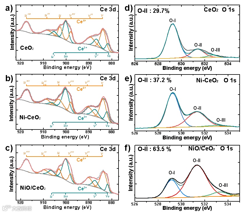 图3. NiO/CeO2样品的XPS光谱。(a-c)Ce3d的分裂光谱;(d-f)原始CeO2、Ni掺杂的CeO2和NiO/CeO2异质结构的O1s分裂光谱。