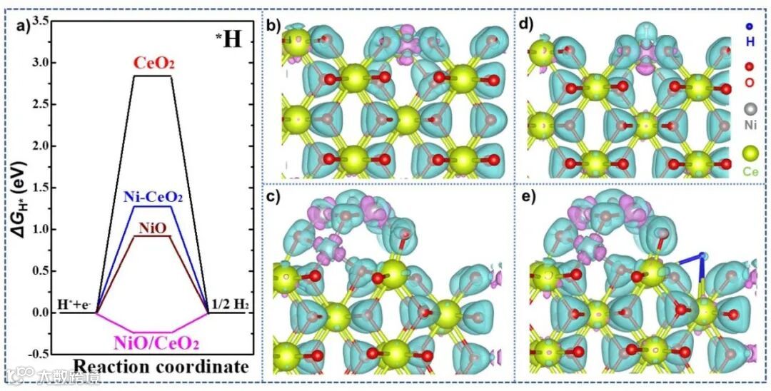图5.(a)CeO2、Ni-CeO2、NiO和NiO/CeO2的ΔGH*;(b,c)Ni-CeO2和NiO/CeO2界面的原始模型;(d,e)Ni-CeO2和NiO/CeO2界面H吸附模型的差分电荷密度。