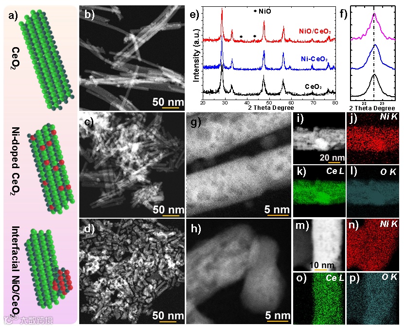 图1. 合成的CeO2和Ni改性的CeO2的微观结构分析。(a)随着Ni含量的增加,Ni-CeO2纳米复合材料的结构示意图;(b-d)原始CeO2、Ni掺杂CeO2和NiO/CeO2异质结构的低倍HAADF图像;(e)XRD光谱;(f)111衍射峰的放大视图;(g,h)分别为Ni掺杂的CeO2和NiO/CeO2异质结构的高倍HAADF图像;(i-p)EDS元素映射。