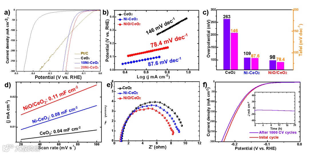 图2. 所制备的催化剂在1M KOH中的HER性能:(a)LSV曲线,(b)相应的Tafel图,(c)过电位和Tafel斜率的汇总值;(d)电流密度的线性拟合;(e)原始CeO2、掺杂Ni的CeO2和NiO/CeO2异质结构的奈奎斯特图;(f)NiO/CeO2异质结构在1000次循环后的稳定性测试。