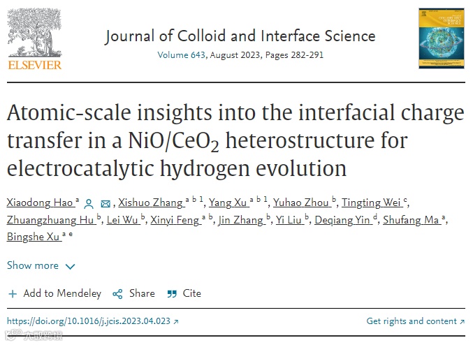 Xiaodong Hao, Xishuo Zhang, Yang Xu, Yuhao Zhou, Tingting Wei, Zhuangzhuang Hu, Lei Wu, Xinyi Feng, Jin Zhang, Yi Liu, Deqiang Yin, Shufang Ma, Bingshe Xu. Atomic-scale insights into the interfacial charge transfer in a NiO/CeO2 heterostructure for electrocatalytic hydrogen evolution,Journal of Colloid and Interface Science, 2023, 643, 282.