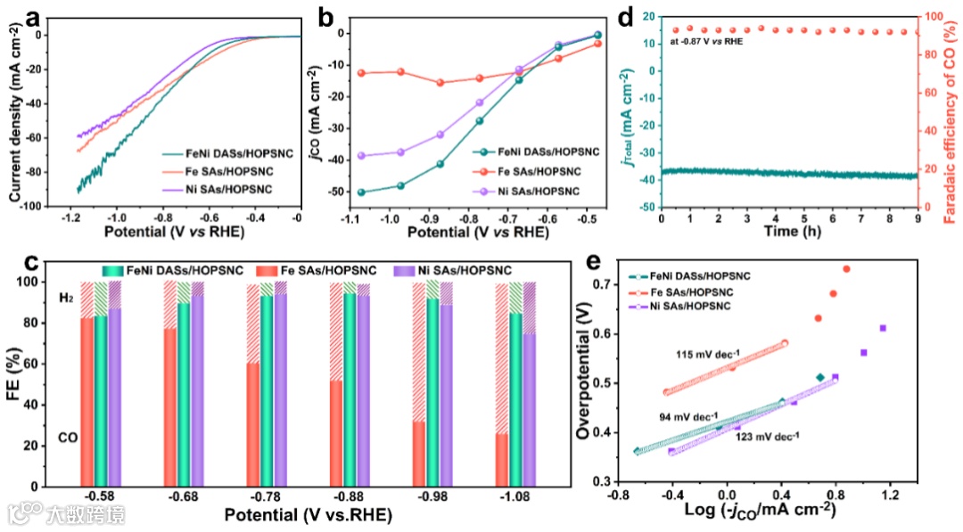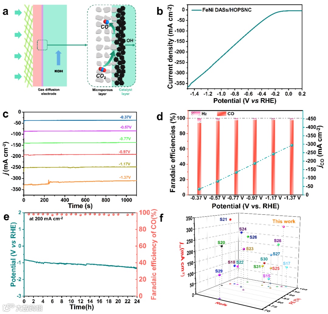 FeNi DASs/HOPSNC对CO2RR具有优异的活性,在H池中CO2RR的总电流密度可以达到90 mA cm-2,超过文献中报道的绝大多数催化剂。在液流池中CO的分电流密度达到370mA cm-2,法拉第效率高达99%。在200 mA cm-2的电流密度下能够保持20h以上的长时间稳定运行。