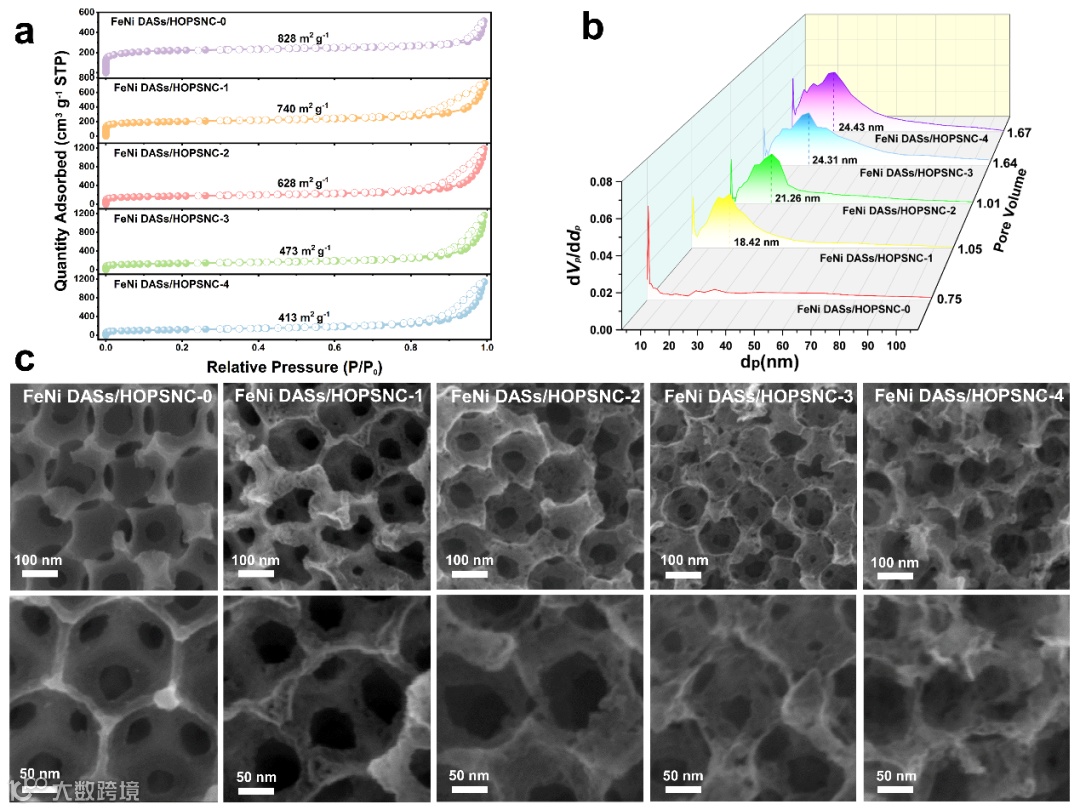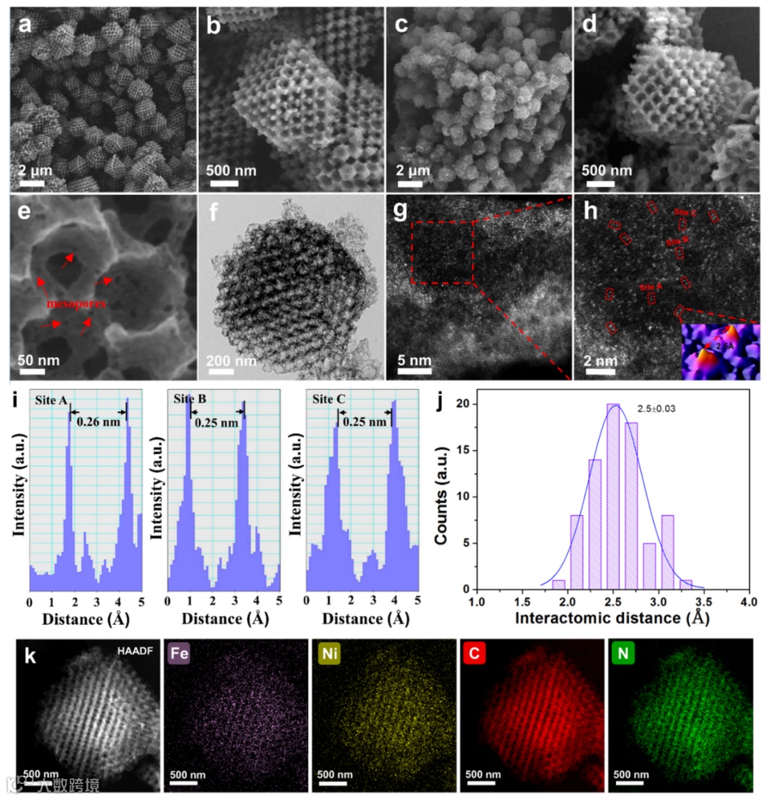 通过添加DCDA作为原位NH3来源,以实现在热解过程中对孔隙率的系统控制,构建了具有丰富内置介孔的有序分级孔超结构。通过在有序大孔骨架中引入额外的二级介孔获得了这种独特的超结构,大大提高了活性位点的可及性和传质性能。同时,在热活化过程中,高含量的氮可以促使ZIF框架内的Fe和Ni离子可以原位转变为高度分散的Fe-Ni双原子位点,缓解团聚,有利于增加双原子位点密度。