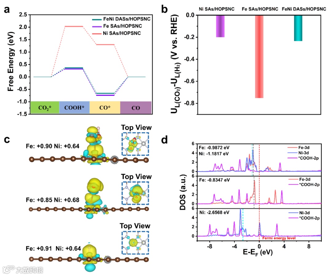 进一步的DFT计算表明通过引入邻近的Fe中心,Ni中心的d轨道能级向费米能级移动,从而降低了速率控制步骤的反应能垒,并促进了CO2RR过程中的*COOH的生成和*CO的解吸,同时抑制了HER,大大提高了催化剂的本征活性和选择性。