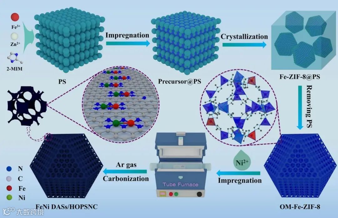 通过双溶剂诱导的多相成核方法制备了Fe掺杂的有序大孔ZIF-8单晶,进一步通过浸渍法掺入镍,随后与二氰二胺(DCDA)在高温下热解,利用二氰二胺原位产生的氨气实现对有序大孔空腔均匀刻蚀,构筑了具有有序分级孔超结构的FeNi DASs/HOPSNC催化剂。