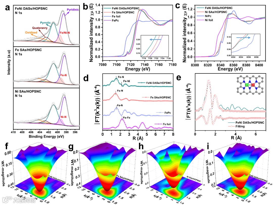 XANES测试表明FeNi DASs/HOPSNC中Fe、Ni的价态位于0到+2价之间,EXAFS表明FeNi DASs/HOPSNC中存在2-N桥联的双原子对配位构型,且没有纳米颗粒或者金属团簇的存在。