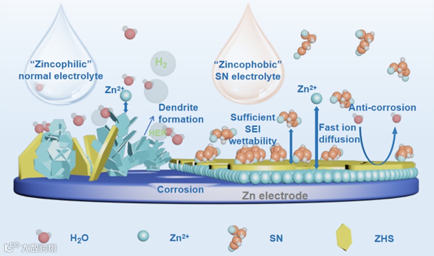 锌金属电池在大规模存储中显示出巨大的应用前景,因为其具有安全性高、成本低、环境友好、合成条件简单等优点在清洁能源体系中受到广泛关注。然而,较活泼的锌金属在水系电解质中不可避免地会发生自发腐蚀和溶解等问题,导致锌负极的可逆性一直无法满足商业化的需求。