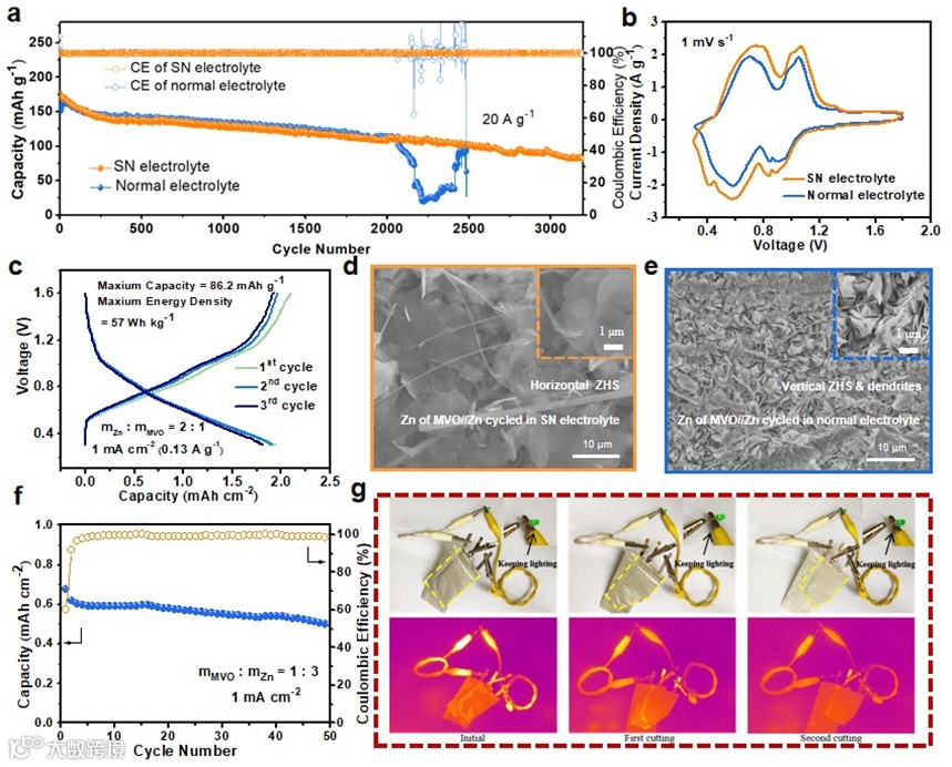 图5. (a) 扣式电池在20 A g-1电流密度下的循环寿命测试。(b) 两种电解质的CV曲线对比。(c) 软包装电池的恒电流充放电曲线(mmvo:mZn=1:2)。(d) 使用SN电解质的纽扣电池循环后锌的SEM。(e) 使用传统电解质的纽扣电池循环后锌的SEM。(f) 软包装电池的循环测试(mmvo:mZn=1:3)。(g) 剪切试验及其红外热像图。