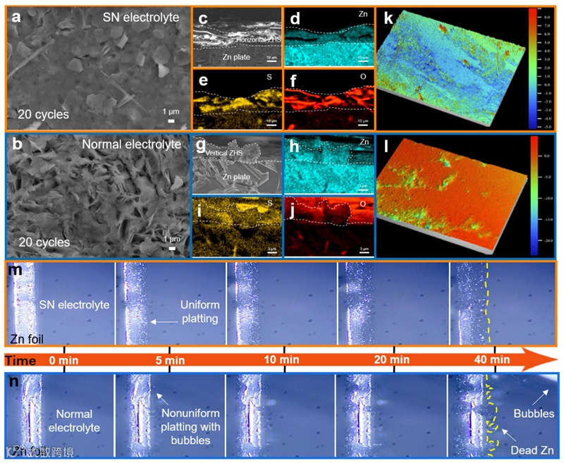 图2. 在(a) SN电解质和(b) 传统电解质中循环后的表面SEM图。(c) 在SN电解质中循环后的表面SEM。(c) SN电解质中循环后的锌片的截面SEM图和(d) Zn、(e) S、(f) O元素的EDS图谱。(g) 传统电解质中循环后的锌片的截面SEM图和(g) Zn、(i) S、(j) O元素的EDS图谱。(k) H-SEI和(l) V-SEI的3D白光轮廓。(m) SN电解质和(n) 传统电解质的原位光学测试。