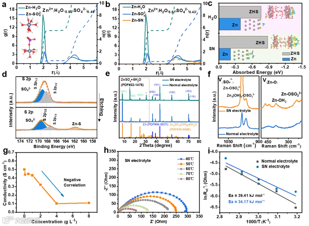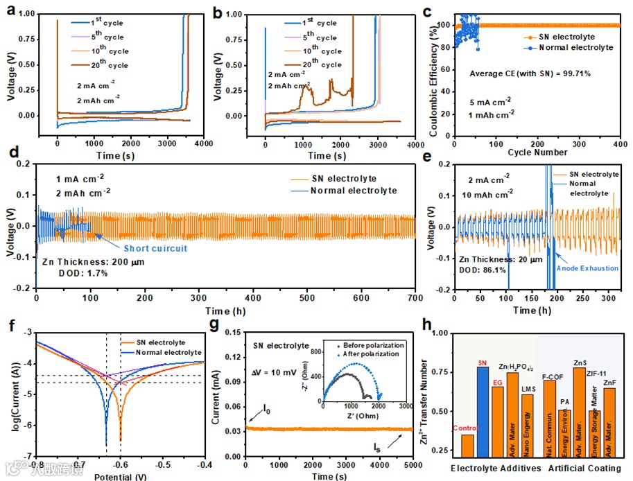 图4. (a) SN电解质的库伦效率测试曲线。(b) 传统电解质的库伦效率测试曲线。(c) 两种电解质长循环下的平均库伦效率测试的比较。(d) 低放深度下的对称电池寿命测试。(e) 高放深度下的对称电池寿命测试。(f) 两种电解质的腐蚀极化曲线。(g) 极化前后SN电解质的EIS变化和恒电位极化曲线。(h) Zn2+转移数与最近发表的文献值的比较。