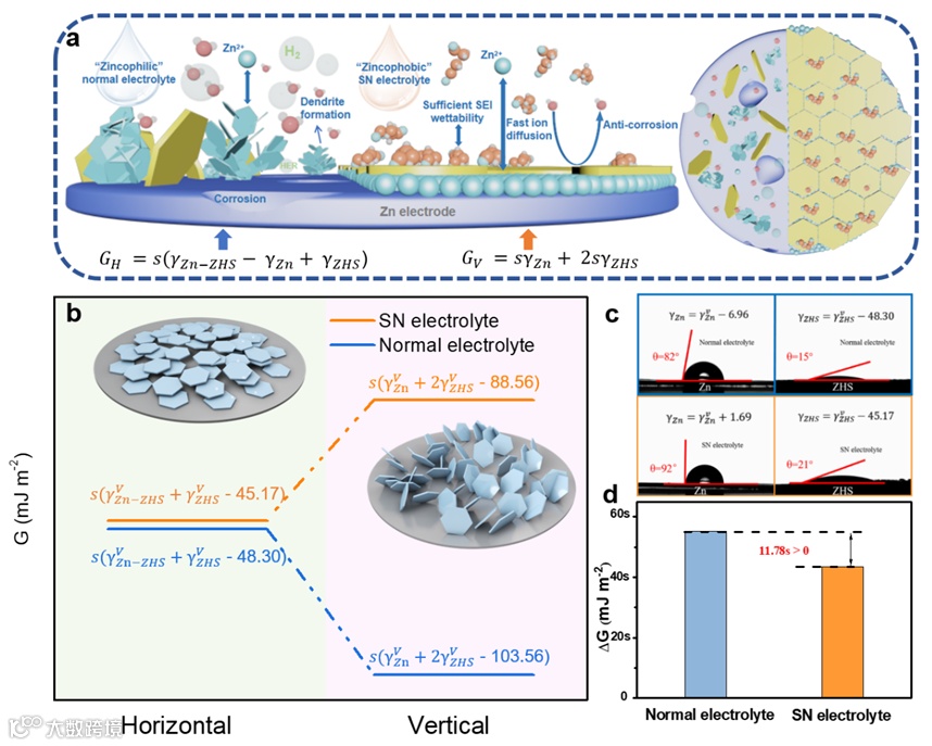 图1. (a) 疏锌亲SEI的电解质的示意图。(b) SN电解质和传统电解质中两种生长状态的自由能及自由能的计算表达式。(c) 接触角测试和相应的表面能。(d) 两种电解质中自由能的变化量的比较。
