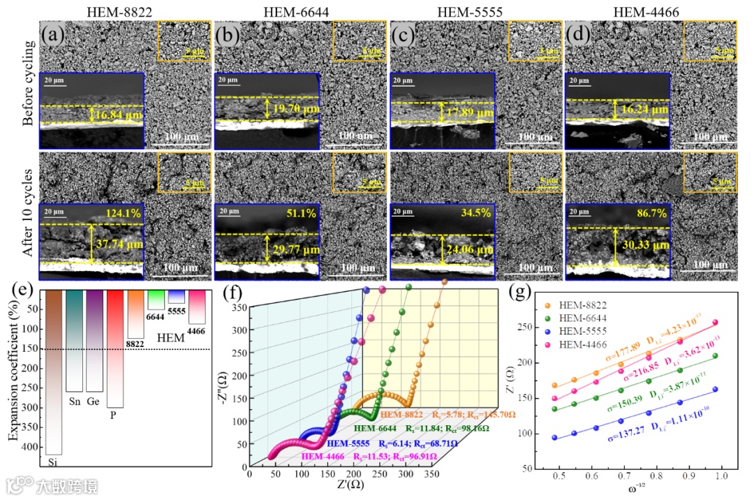 图5. 系列ZnxGeyCuzSiwP2高熵固溶体电极循环前后的SEM形貌及横截面图片(a-d),体积膨胀系数对比(e),电化学阻抗EIS图谱(f)及扩散系数对比(g)。
