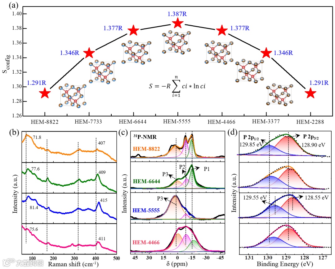 对上述合成的系列ZnxGeyCuzSiwP2构型熵进行计算,发现等比例固溶的Zn0.5Ge0.5Cu0.5Si0.5P2因其阳离子无序程度最大具有最高的构型熵,其构型熵的差异也在Raman表征(峰位红移)、31P-NMR固体核磁共振测试(P3占主导)和XPS图谱(P 2p峰位低结合能位移)中得到进一步探究和验证。