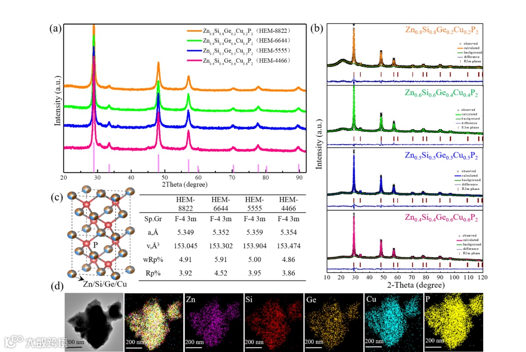 图2. 系列ZnxGeyCuzSiwP2高熵固溶体的XRD图谱(a),Rietveld结构精修图谱(b),晶体结构示意图和晶胞参数(c)及TEM元素分布图片(d)