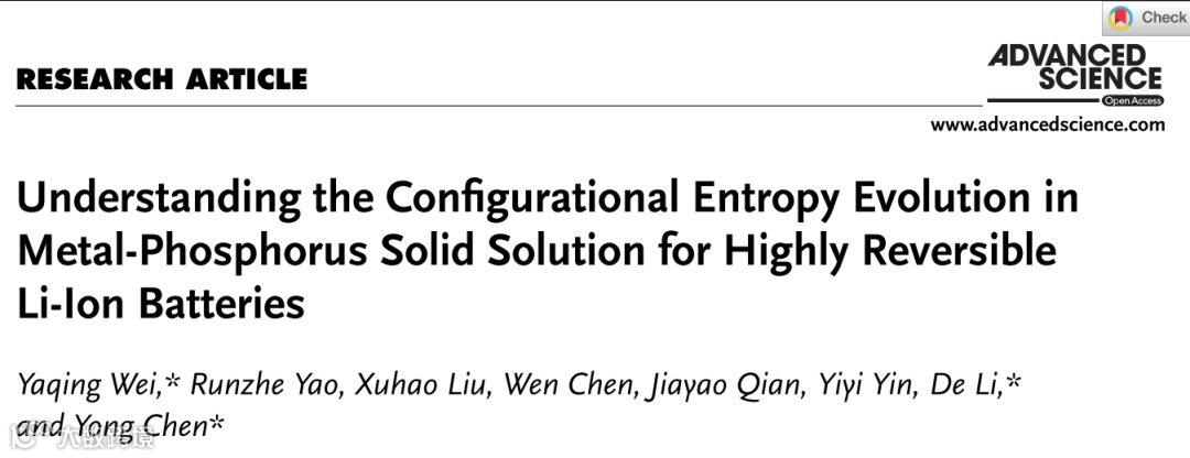 Yaqing Wei*, Xuhao Liu, Runzhe Yao, Jiayao Qian, Yiyi Yin, De Li*, Yong Chen*, Understanding the Configurational Entropy Evolution in Metal‐ Phosphorus Solid Solution for Highly Reversible Li‐Ion Batteries. Advanced Science 2023, 2300271.