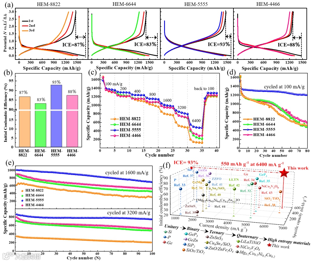 图4. 系列ZnxGeyCuzSiwP2高熵固溶体的充放电曲线(a),首次库伦效率(b),倍率性能测试(c),循环性能测试(d-e)及文献报道性能比较(f)。