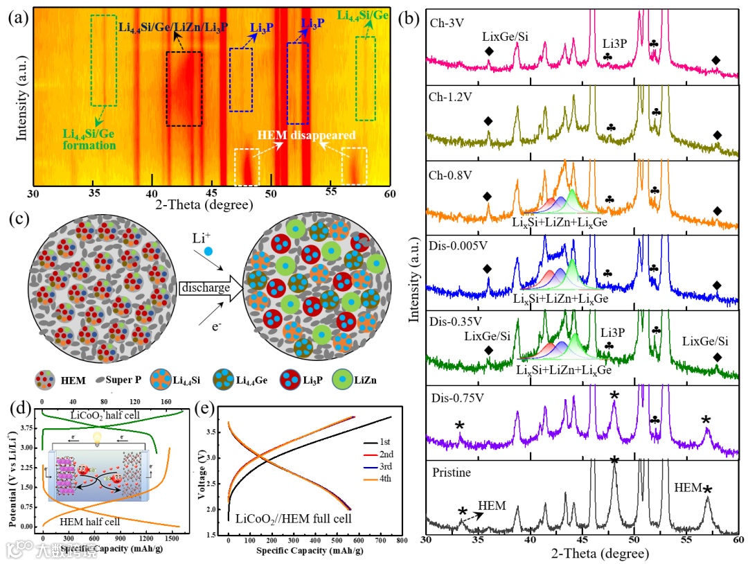 图6. ZnxGeyCuzSiwP2电极原位in-situ XRD测试(a-b),反应机理图示(c)及全电池组装测试(d-e)