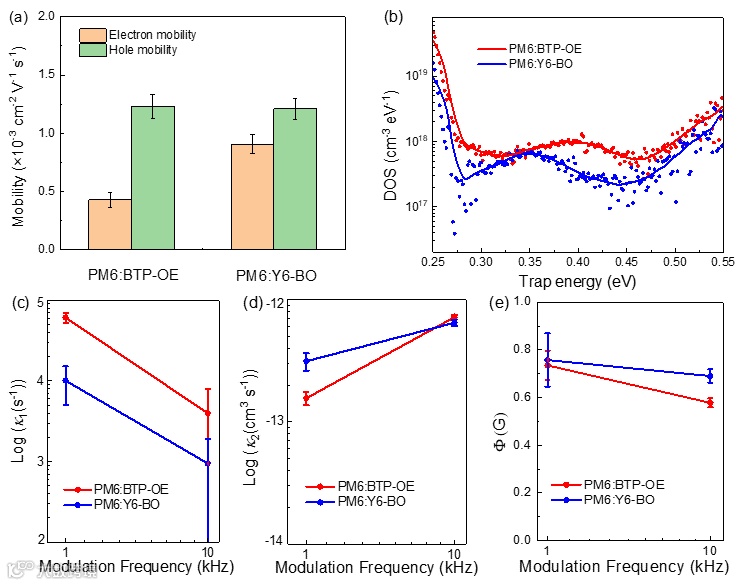 图4.(a)PM6:BTP-OE和PM6:Y6-BO共混薄膜中的载流子迁移率统计图;(b)缺陷态密度分布的DOS曲线图;(e)一阶(k1)和(f)二阶(k2)电荷复合的结果拟合参数,以及(g)自由载流子产率Φ(G)。