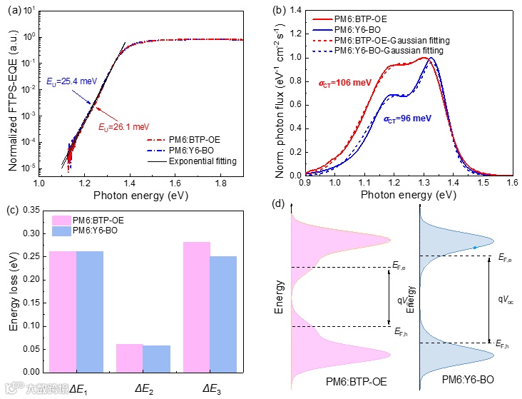 图5. 基于PM6:BTP-OE和PM6:Y6-BO共混薄膜器件的(a)归一化FTPS‒EQE光谱,(b)EQEEL光谱以及(c)辐射复合和非辐射复合能量损失统计图,(d)两种器件能量无序和能量损失的示意图